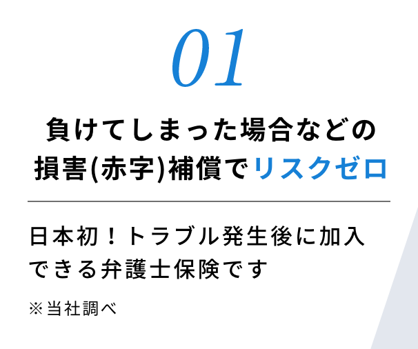 日本初となる法的トラブル発生後に加入しても補償が得られる弁護士保険です。