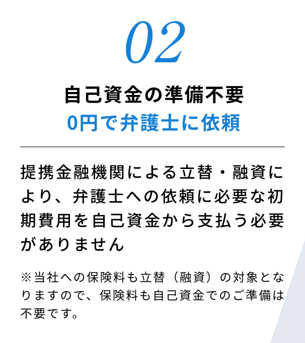 事後型弁護士保険ゼロ(立替対応タイプ)は提携金融機関による初期費用(弁護士への着手金等、当社への保険料)の立替・融資サービスを用意しているため、自己資金「ゼロ」で保険加入および弁護士依頼が可能です。※立替・融資サービスは当社の提携金融機関が提供するサービスです。